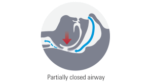In most cases of obstructive sleep apnea, air stops flowing to the lungs because of a blockage (or obstruction) in the upper airway-that is, in the nose or throat. The upper airway could become blocked due to: the muscles relaxing too much during sleep, which blocks sufficient air from getting through* the weight of your neck narrowing the airway inflamed tonsils, or other temporary reasons structural reasons, like the shape of the nose, neck or jaw * This narrow airway causes a vibration in your throat, which creates the sound of snoring.
